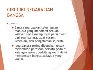 Play this game to review Other. CIRI NEGARA DAN BANGSA 11CIRI-CIRI NEGARA BANGSA KERAJAAN ALAM MELAYU Pembentukan ciri-ciri negara bangsa kerajaan Alam Melayu berbeza daripada yang berlaku di Barat.