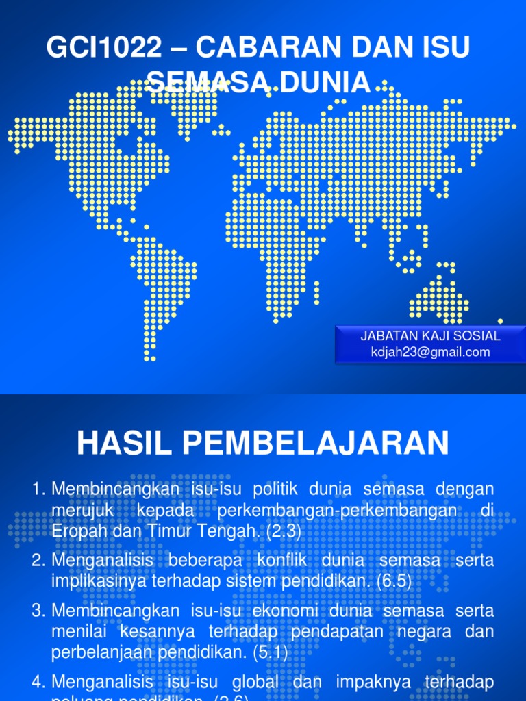 Membincangkan isu-isu ekonomi dunia semasa yang memberi kesan terhadap pendapatan negara dan perbelanjaan pendidikan di. Isu-isu agama dan sekularisme dalam ruang sosio-politik di Malaysia Issues of religion and secularism in the socio-political space in Malaysia December. Isu-isu Kontemporari dalam Politik Dunia Deskripsi Kursus ini adalah sebahagian daripada projek IPSAMOOC sebuah syarikat usahasama Federica Weblearning - IPSA Persatuan Sains Politik Antarabangsa dengan kematian Soviet Union dan akhir Perang Dingin Orde Dunia yang telah ditubuhkan selepas Perang Dunia Kedua mula menjalani perubahan ketara.